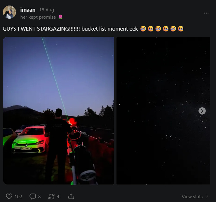 sitting under the night sky that belongs equally to everyone, stars spread wide above me, i felt something i was waiting to feel all summer. i had seen stars before, of course, but not like that. not a sky so clear that it felt like the universe was opening itself up for me. and in that moment, all i could think about was Allahās perfection. how He created something so breathtakingly infinite, and how tiny i felt beneath it. that awe felt like a balm to the hollowness i had carried for weeks.